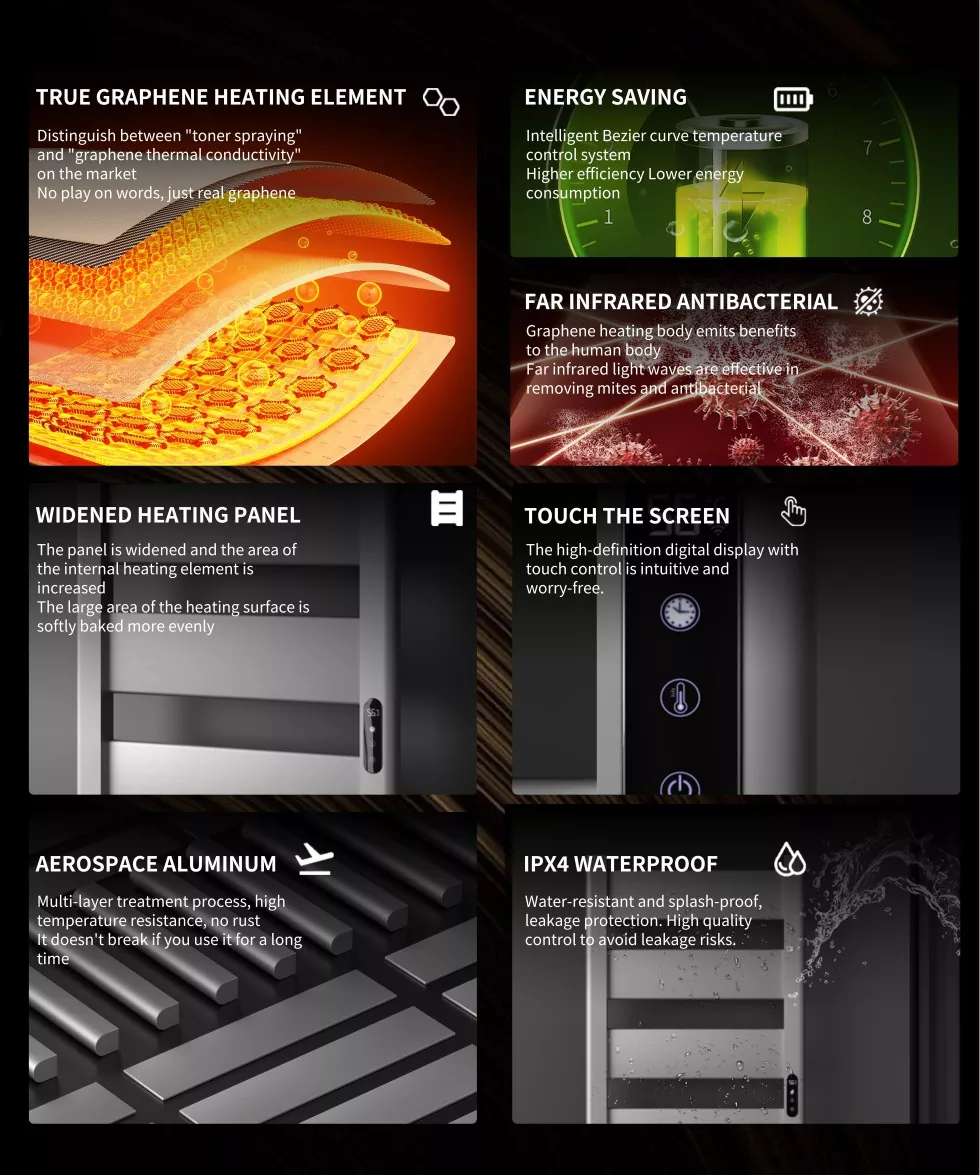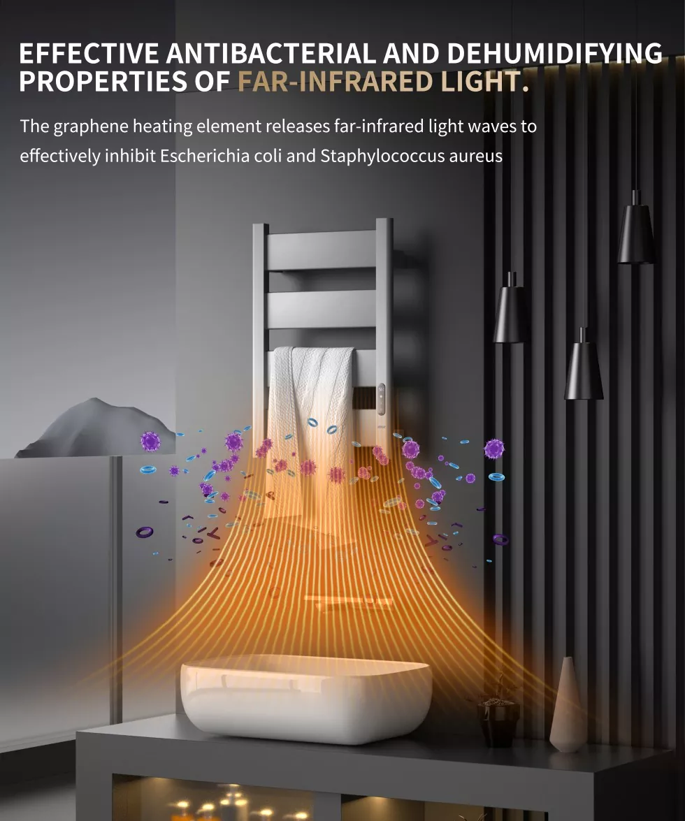 Acest raft de prosop electric de grafen de 157W folosește un material eficient de încălzire a grafenului, combinând încălzirea rapidă și caracteristici semnificative de economisire a energiei. Poate oferi rapid chiar căldură prosoapelor, asigurând confortul final în timpul consumului de iarnă rece. Datorită tehnologiei grafene, raftul de prosop are o durată de viață mai lungă și nu are o degradare a performanței după utilizarea pe termen lung, demonstrând o stabilitate extraordinară.