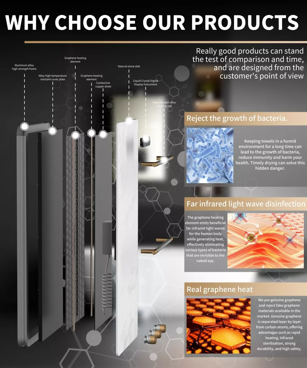 Suportul de prosop de rocă de grafen negru usucă rapid prosoape, menținându -și uscăciunea și prevenind creșterea bacteriilor și a matriței cauzate de umiditate, creând un mediu de utilizare mai sănătos. Prin utilizarea radiațiilor infraroșii de 4-16 μm m pentru a transfera energia termică, a verificat de instituțiile autoritare că eficiența uciderii bacteriilor dăunătoare, cum ar fi Staphylococcus aureus, este de până la 95%, iar efectul de îndepărtare a acarianului este 100%, reducând efectiv reproducerea bacteriană și reducând apariția orodurilor.