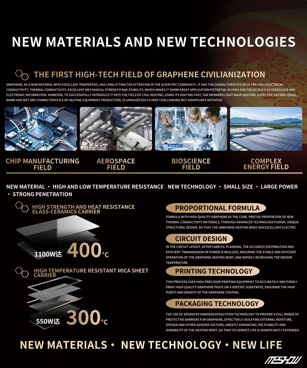 Meshow se concentrează pe proiectarea și producția de încălzitoare de grafen cu infraroșu de înaltă calitate, portabile negre. Lansați mai multe produse personalizate pentru piața națională. Încălzitoarele noastre nu sunt numai de economie de energie și ecologic, dar au și un aspect elegant și performanțe excelente.