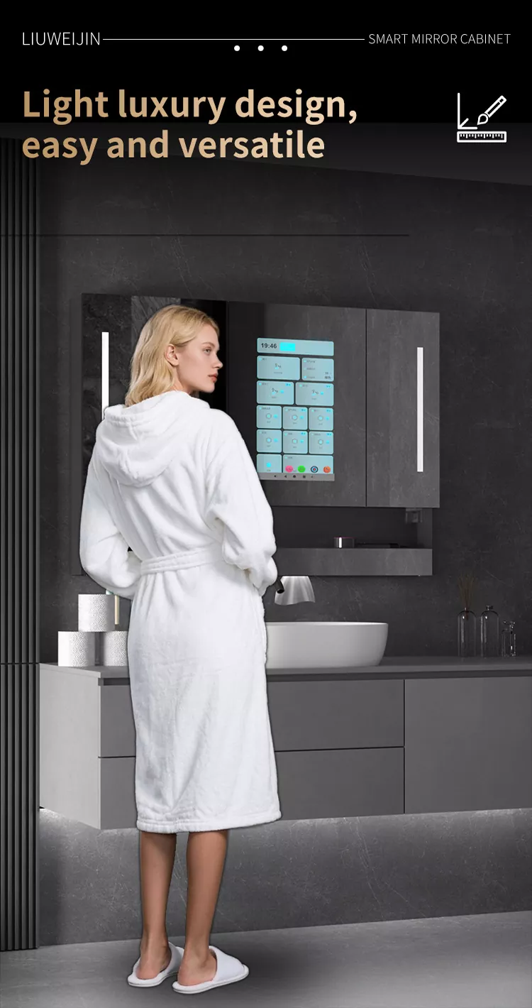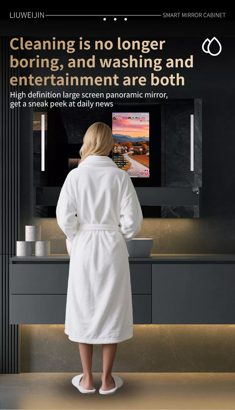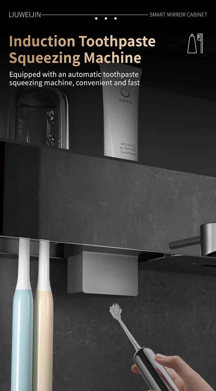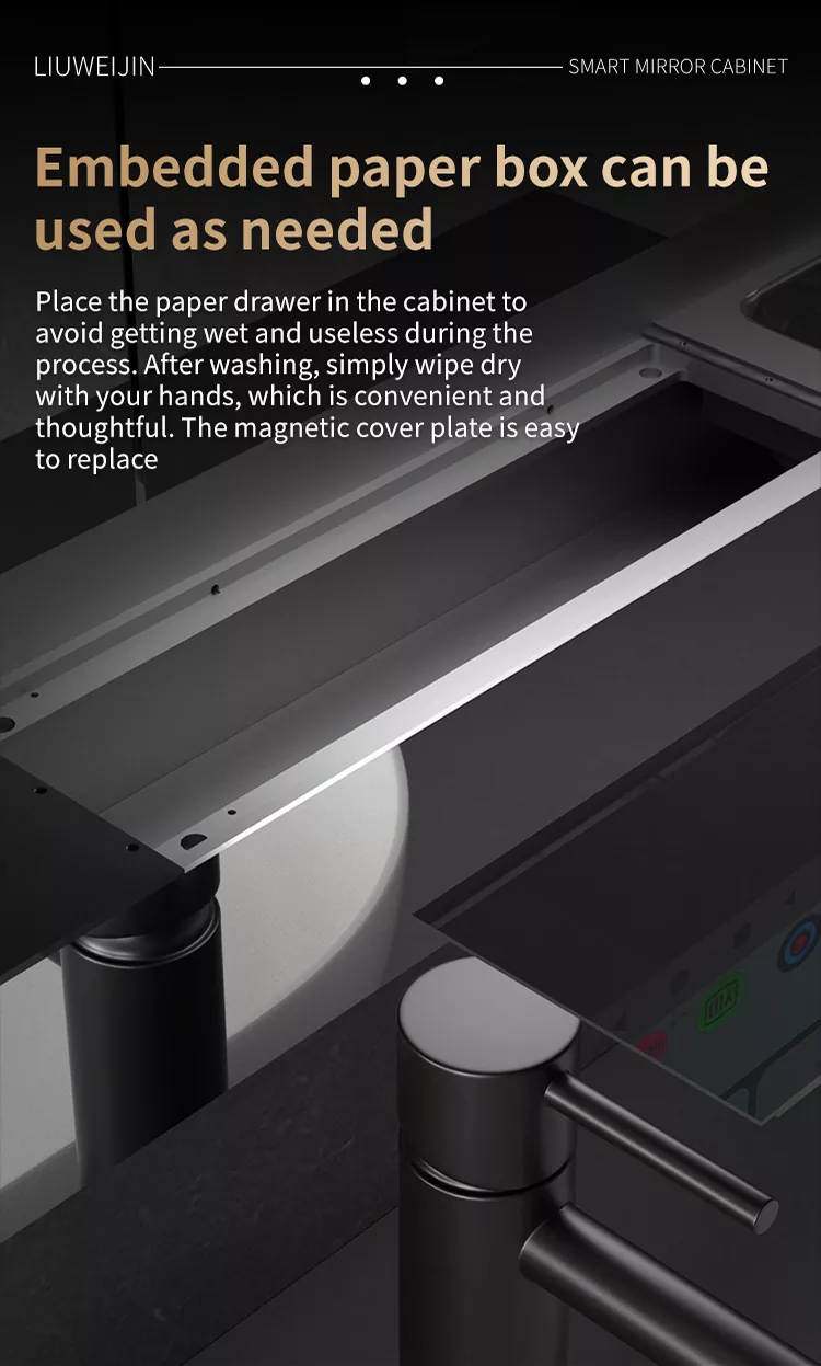 This Liuwei Jinshi Graphene Smart Bath Mirror Cabinet is made of alloy material, which is durable and moisture-proof.Standard led light strip, automatic toothpaste squeezing machine, tooth cup draining rack, tooth cup toothbrush ultraviolet disinfection device, shaver disinfection device, embeddedPaper drawer, dual-purpose conversion device for hair dryer/dryer, mirror high-definition display touch Ecran, dezinfectant de mână de inducție, sistem de defogare a oglinzilor, centru de control de tip Cheng. Modelul de lux este echipat cu încălzire grafen și uscare a prosoapelor, sistem inteligent de parfumuri și sistem de purificare a aerului. În plus, ecranul mare acceptă divertisment audio și video, afișare meteo și timp, descărcare de aplicații etc., pentru a -ți îmbogăți viața.