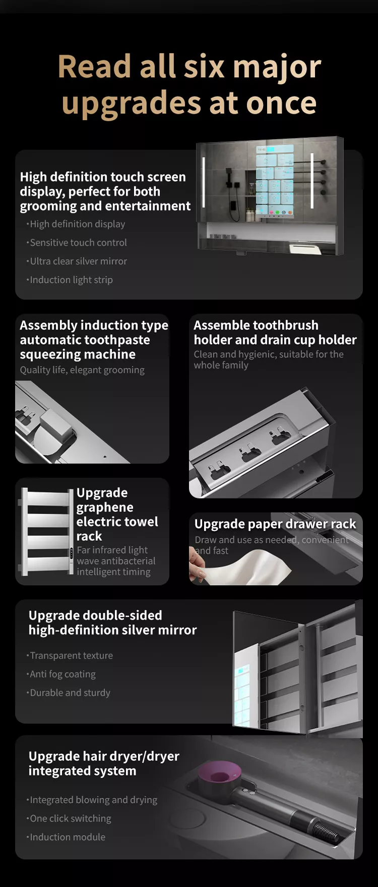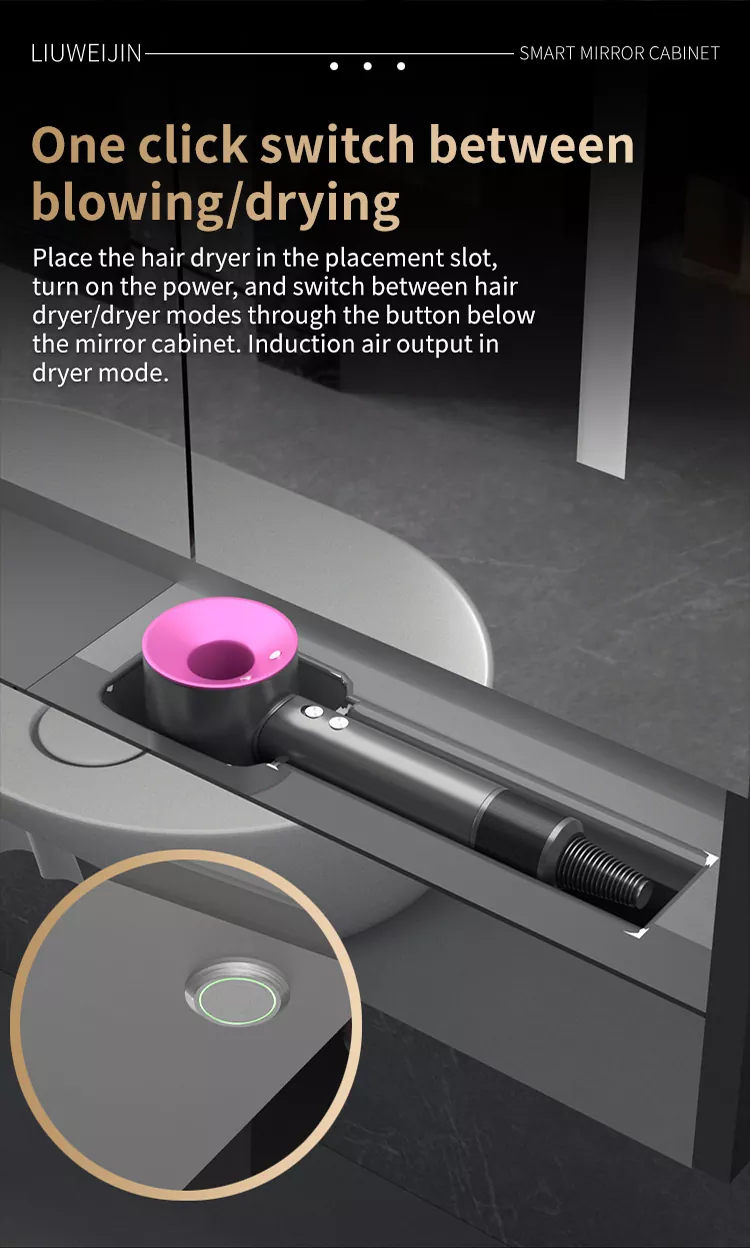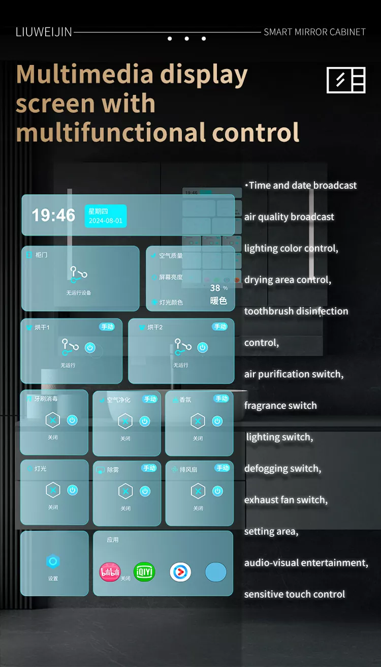 This Liuwei Jinshi Graphene Smart Bath Mirror Cabinet is made of alloy material, which is durable and moisture-proof.Standard led light strip, automatic toothpaste squeezing machine, tooth cup draining rack, tooth cup toothbrush ultraviolet disinfection device, shaver disinfection device, embeddedPaper drawer, dual-purpose conversion device for hair dryer/dryer, mirror high-definition display touch Ecran, dezinfectant de mână de inducție, sistem de defogare a oglinzilor, centru de control de tip Cheng. Modelul de lux este echipat cu încălzire grafen și uscare a prosoapelor, sistem inteligent de parfumuri și sistem de purificare a aerului. În plus, ecranul mare acceptă divertisment audio și video, afișare meteo și timp, descărcare de aplicații etc., pentru a -ți îmbogăți viața.